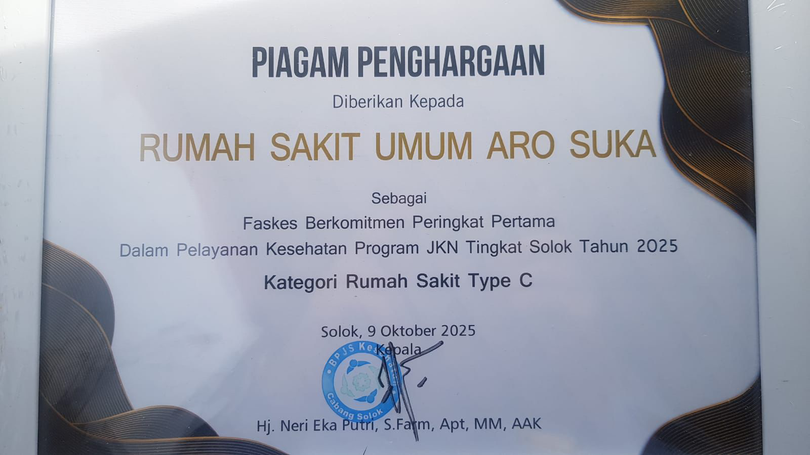 Keterangan Gambar : RSUD Arosuka di Anugerahi Piagam Penghargaan sebagai Faskes Berkomitmen Peringkat Pertama Dalam Pelayanan Kesehatan Program JKN Tingkat Solok Tahun 2025, Kategori Rumah Sakit Tipe C